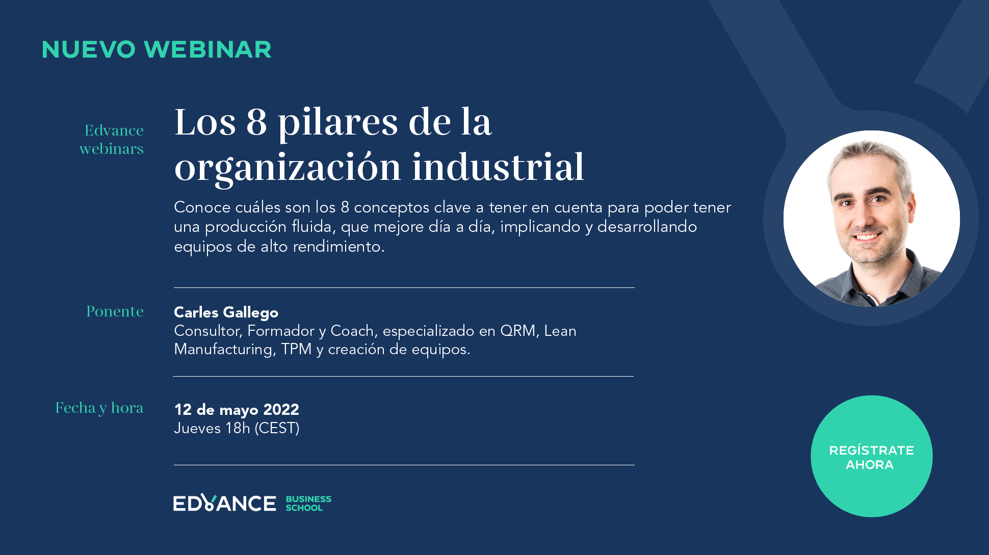 Inscríbete al webinar “8 pilares de la organización industrial productiva” con Carles Gallego, docente en Edvance Business School y consultor, formador y coach especializado en QRM, Lean Manufacturing, TPM y creación de equipos. Será el próximo 12 de mayo a las 18h (CEST).