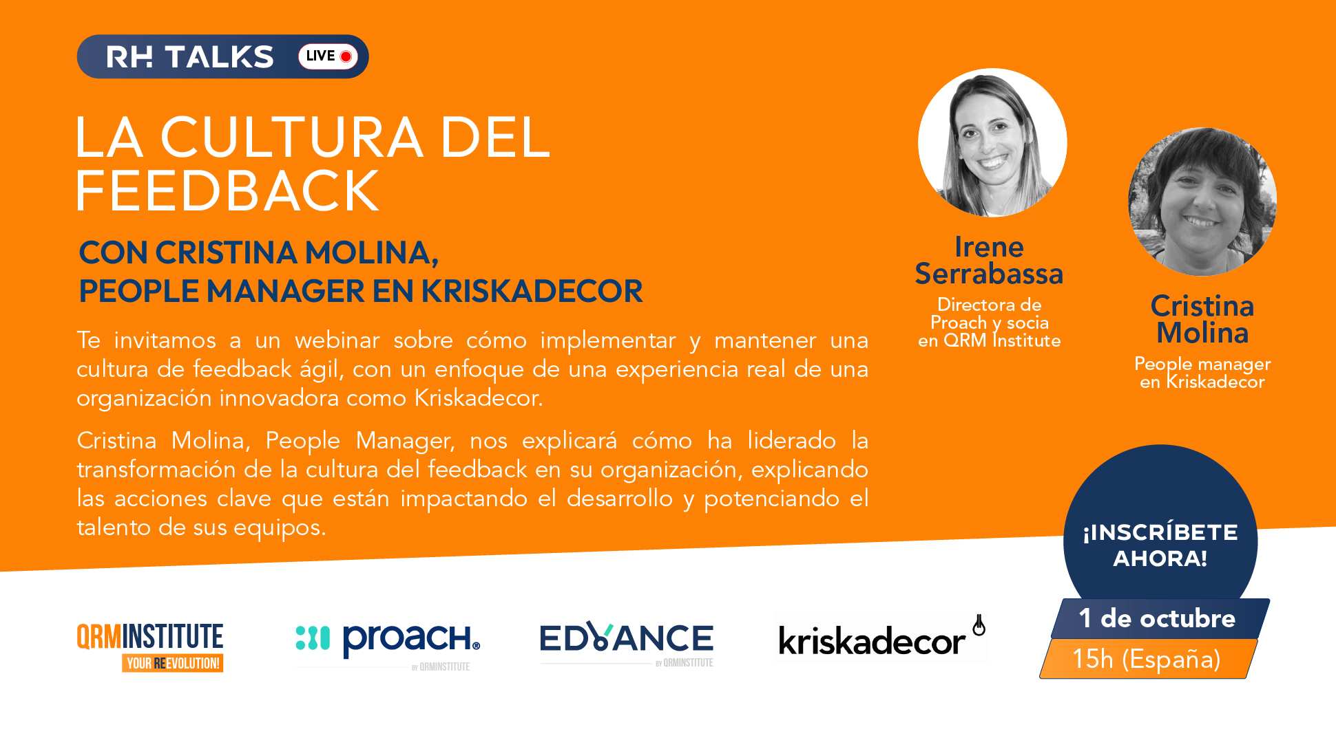 Inscríbete al webinar “La cultura del feedback” con Irene Serrabassa y como invitada, contaremos con Cristina Molina, People Manager en Kriskadecor. Será el próximo martes 1 de octubre a las 15h (España).