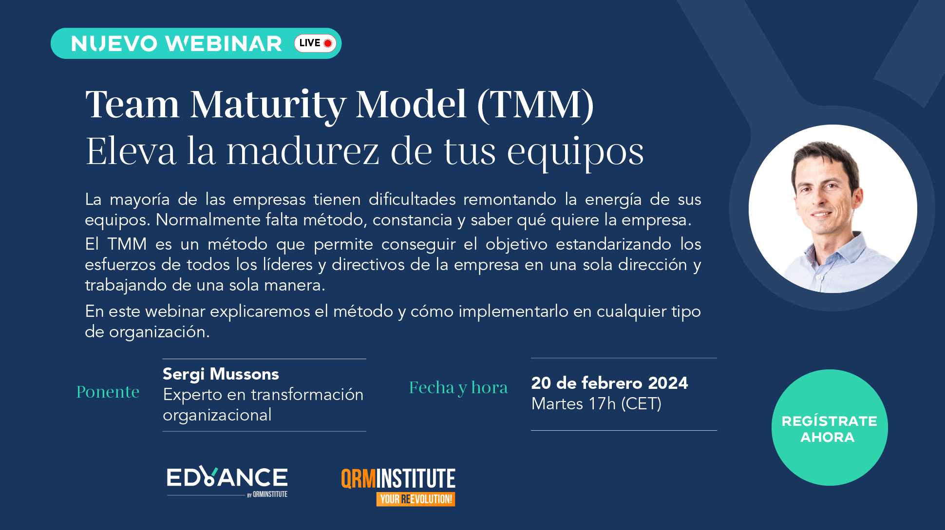 Inscríbete al webinar “Team Maturity Model (TMM): eleva la madurez de tus equipos” con Sergi Mussons, consultor especialista en transformación organizacional. Será el próximo martes 20 de febrero a las 17h (CET).